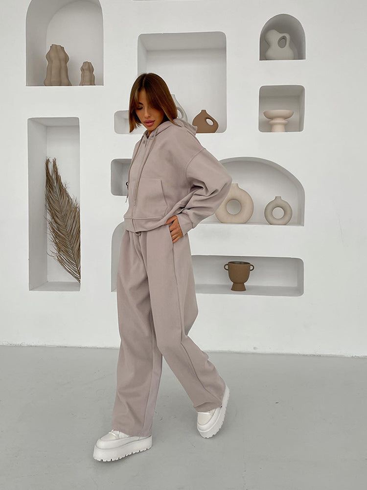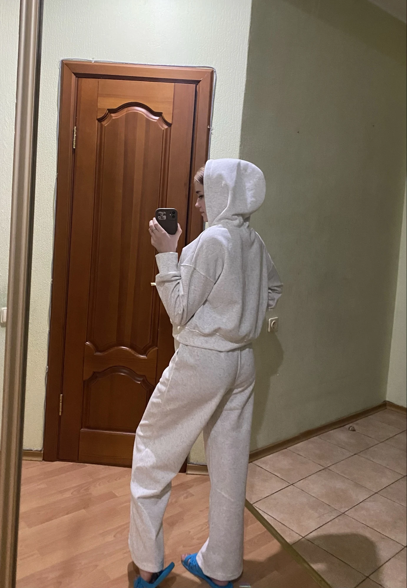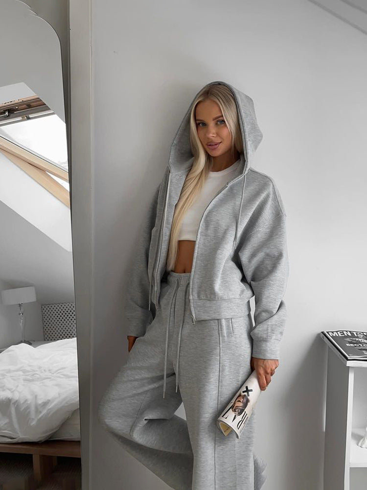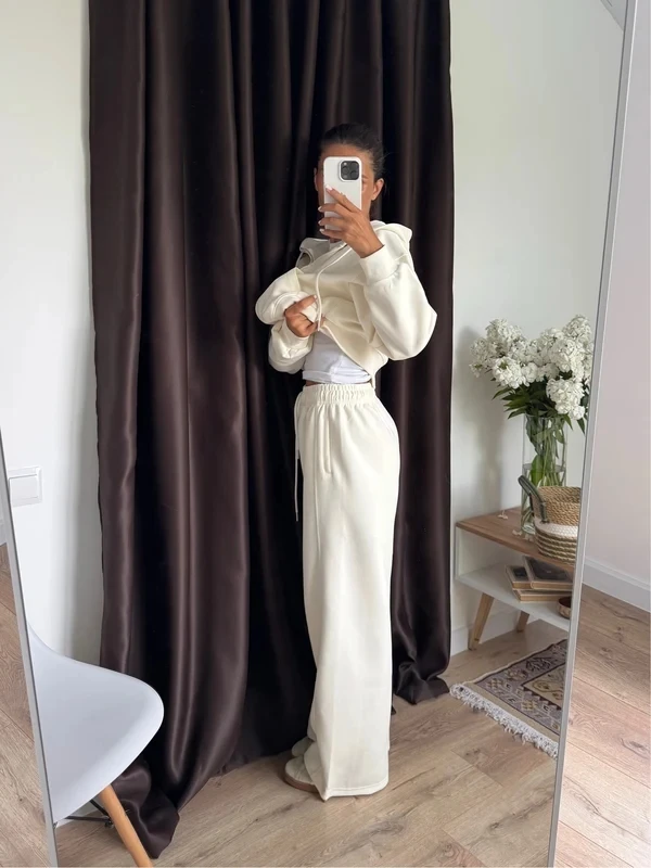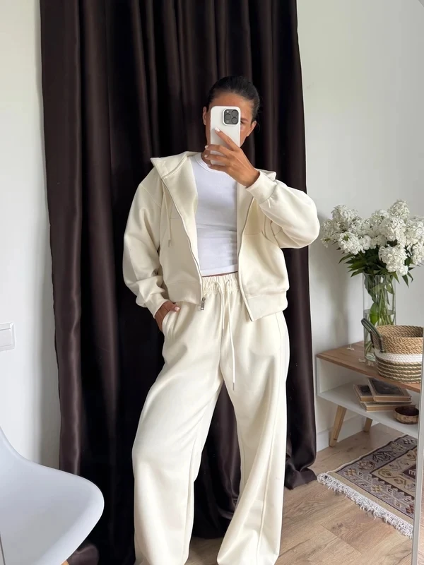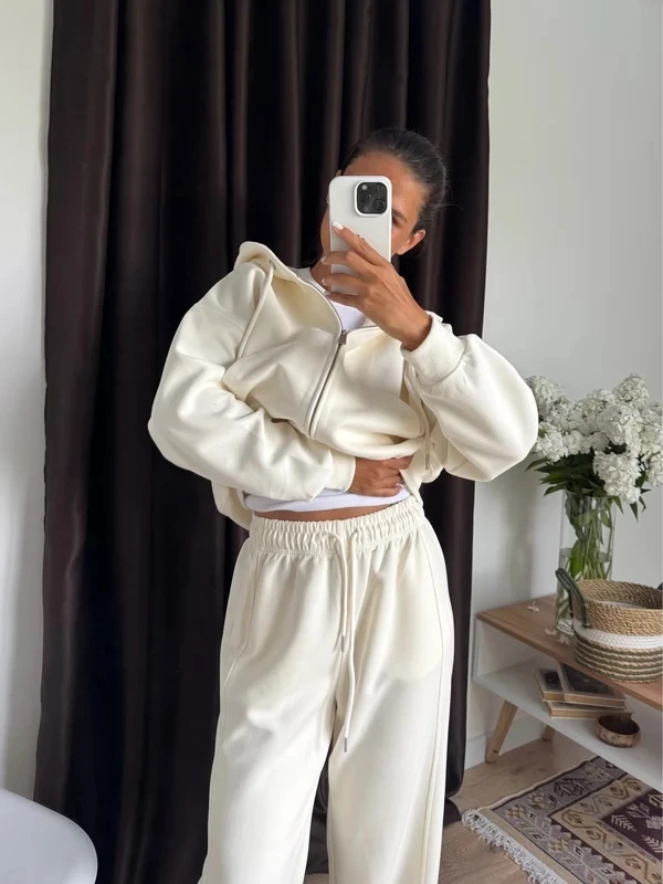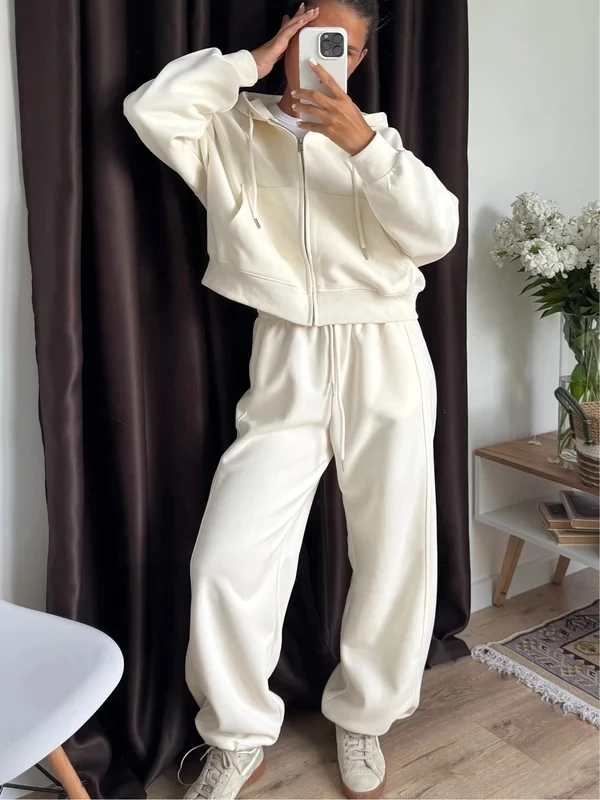 Le haut à capuche, muni d’un cordon ajustable, apporte une touche sportive et contemporaine, tandis que le pantalon à taille élastique garantit un ajustement parfait et un confort sans contrainte. Les finitions soignées et les lignes épurées mettent en valeur un look minimaliste et tendance.